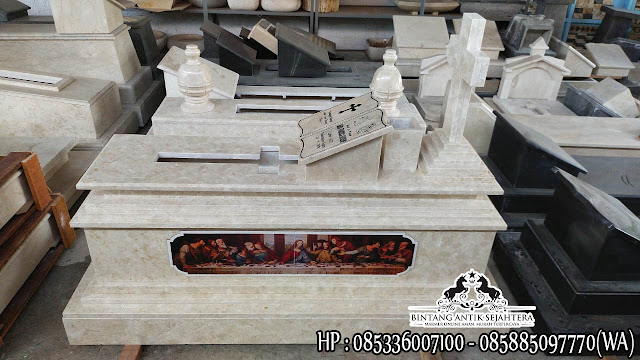 Makam Kristen Perjamuan Kudus - salah satu kijing makam dengan model yang cukup mewah. Model makam ini banyak diminati oleh umat kristiani untuk memperbaiki pusara keluarga. Makam yang cukup tinggi dengan ukuran standart adalah 160x60 cm. Mengapa model makam ini sangat istimewa ? Karena terdapat gambar perjamuan kudus di sisi kanan dan kiri badan makam. Ditunjang dengan bahan yang beda dari biasanya. Kami menggunakan batu alam untuk basic pembuatan kijing makam, salah satunya adalah batu marmer. Marmer lokal asli kota kami Tulungagung, dengan warna batu putih kearah krem dan terdapat serat batu alami khas marmer.